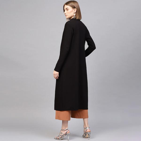 Women Black Ribbed Longline Open Front Shrug